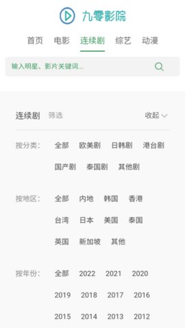 1、 九零影院TV版的资源库十分齐全,用户可以通过影视分类页内的题材、地区、年份、热度、评分等条件轻松查找影片。
