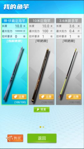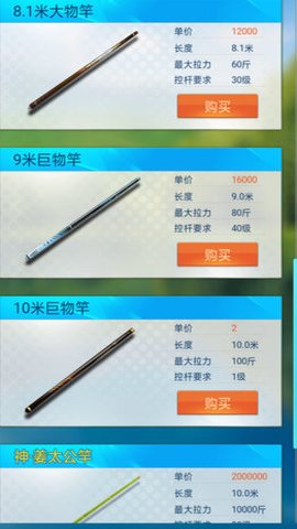 3、游戏中提供了各种不同价格和性能的钓鱼竿供玩家选择,玩家可以根据自己的需求和经济状况来购买适合自己的鱼竿。
