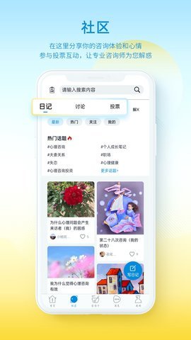 1、 在解X心理App的社区中,用户可以分享自己的咨询体验和心情,参与趣味投票互动。