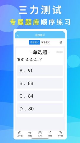 准橙三力测试软件的功能丰富且实用,主要包括以下几个方面:用户可以进行顺序练习,按照题库的顺序在线练习题目,熟悉各种考试知识点。软件支持模拟考试,用户可以随时进行模考,检验自己的当前水平,及时调整学习策略。听题功能的加入,使得用户可以通过语音播报的方式进行听题练习,极大地方便了学习过程。软件还提供了错题记录与复习功能,帮助用户精准识别自己的薄弱环节,提高学习效率。