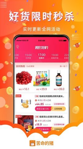 2、 此外苦命的猪App还提供了咚咚抢活动,每天整点限时抢购。