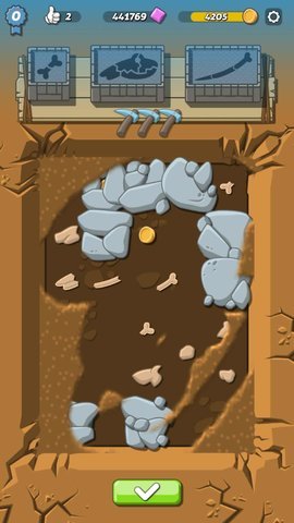 3、挖掘骨头的过程需要利用有限的锄头来挖掘石头,然后得到想要的骨头。