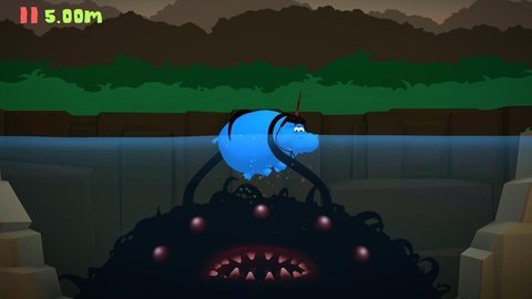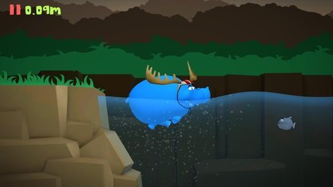 2、游戏采用了可爱的动画风格,河马长着一对大角,游泳的鱼儿在水中穿梭,整个场景显得有些单调。