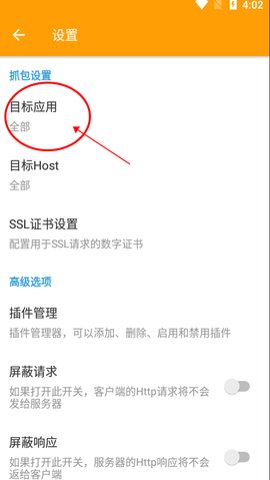 1、返回设置页面,点击"目标应用",进入后可以点击右上角的"+"按钮,然后选择你想要抓包的应用(例如购物软件)。