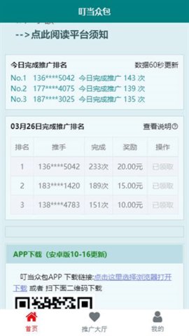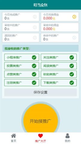 1、用户只需点击平台底部的“推广大厅”,再点击“开始接推广”,系统就会自动帮用户接取大量赚钱任务。