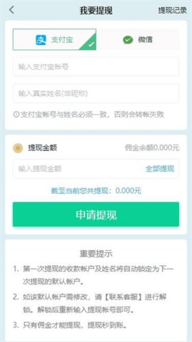 2、 当用户完成任务后,所得的任务收入满1元即可申请提现至钱包或支付宝,提现的过程非常快速,几乎是秒到账,并且不需要支付手续费。