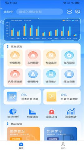 4、全省群测群防员和各级管理人员均可通过App进行地灾巡查,进行人员应急撤离、灾险情速报、防灾知识学习和一键报警等日常管理工作。