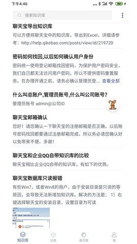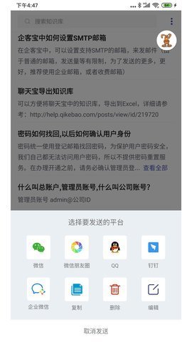 3、 在v25版本中,聊天宝客服助手App增加了分享知识库到千牛和企点的功能,这样用户可以更方便地与其他平台进行知识共享。