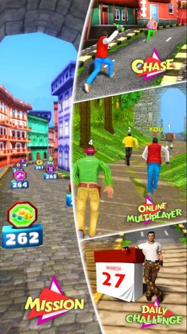 3、在街道上奔跑时,你可以通过跳跃和滑动来避开障碍物,还可以用路上挑选的物体来踢强盗,最终抓住所有的人以取回手提包。
