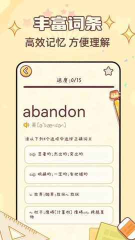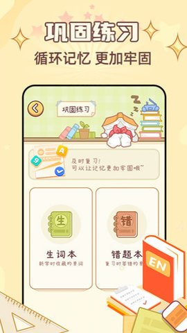 1、在背单词的过程中,用户还可以及时巩固记忆,通过错题巩固功能,发现自己的薄弱点,重点突破。