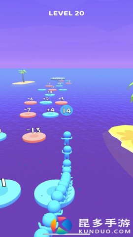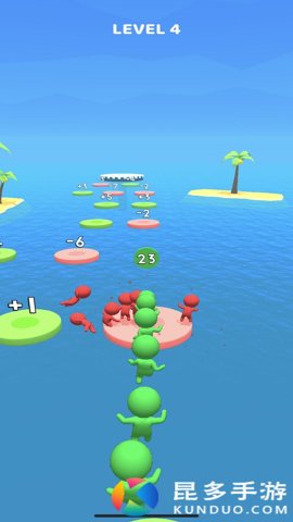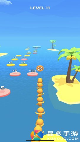 2、控制你的小火柴人在海面上从一个平台跳到另一个平台,在平台上具有一些加数和减数,通过收集加数来增加你的火柴人队伍,火柴人越多,对你在终点获得的奖励就越有利。