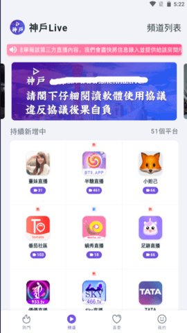 4、神户live整合了百款直播频道,为用户带来与众不同的观看体验,让你随时随地与你最喜爱的主播互动。