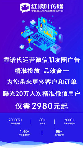 朋友圈广告推广平台是一款值得信赖的广告代运营投放平台,通过其精准的定向投放和按效果付费的服务,可以帮助企业更好地实现广告营销目标。红枫叶公司作为专业的互联网广告代运投放平台,将继续为客户提供优质的服务,帮助他们轻松实现营销和获客。