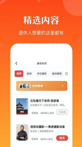 3、红松是一个中老人的兴趣学习平台,名师大咖随时在线提供丰富的课程。