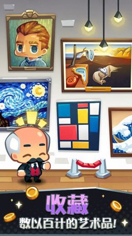 艺术大亨天天拍卖富翁是一款独特的放置模拟经营游戏,以Q萌可爱的卡通画风制作而成。游戏的玩法非常新奇有趣,你将扮演一位艺术馆的经营者,通过竞拍各种名画来获取收益。你需要将这些名画展示在展示厅供游客观赏,并且要注意艺术品的安全,防止被小偷盗窃。