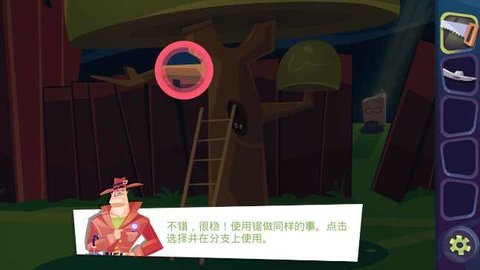 2、玩家将梯子放在院子旁边的大树旁,然后使用锯子将树上的木头锯下来,并将锯下来的木头和背包中的镐头组装在一起。