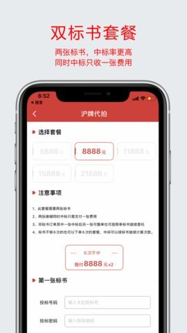 1、 在上海沪牌代拍App中,用户可以根据自己的需求选择标书套餐。