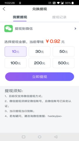 2、用户只需要达到10元的起提现金额,就可以申请提现。