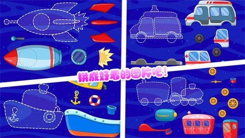 1、你将需要折叠拼图并从不同的部分组装出各种交通工具,如宇宙飞船、轮船、汽车、警车、救护车、直升机、卡车、轻便摩托车和火车等。