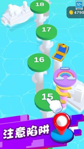 3、玩家需要通过点击屏幕来让球球弹跳并躲避障碍物,收集金币和道具,以获取更高的分数。