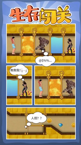 2、生存闯关游戏花裤衩是一款以拉针救援为主题的游戏,玩家需要在一个个关卡中通过简单的拉针方式来进行解谜和闯关。