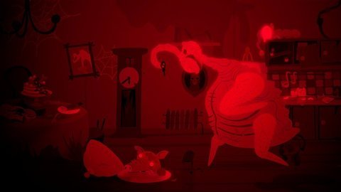 3、房间发出红光,玩具兔子的头肿得像章鱼哥一样,还有三根手指穿透地板。