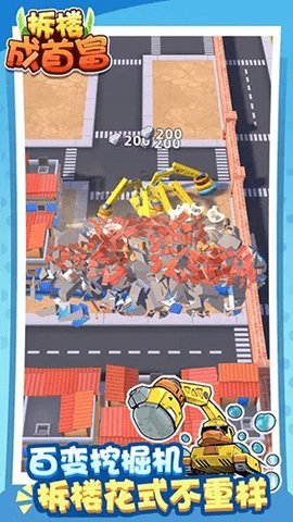 拆楼成首富手游是一款休闲闯关玩法的小游戏,玩家将扮演一位经营挖掘机的建筑工人,开始自己的拆房之旅。游戏中,玩家需要将拆下来的石块送往加工厂进行加工,将其转化为砖块。然后,搬运工会将这些砖块运送到建筑队,用于建造摩天大楼,从而赚取足够的钞票,最终打造出自己的商业帝国。
