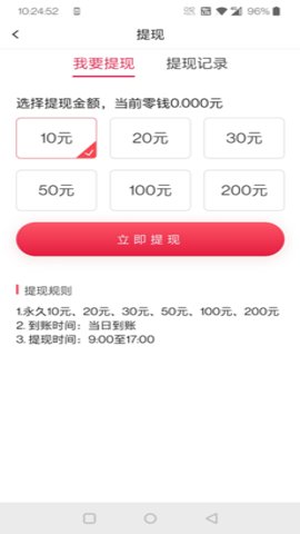4、用户可以从10元起进行永久提现,还支持大额提现,并且当天就能到账。