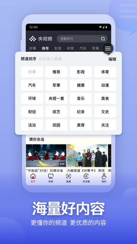 2、央视频作为背靠中央广播电视总台的平台,为用户提供了丰富多样的内容,包括时事资讯、轻松娱乐、热播节目、赛事直播等。