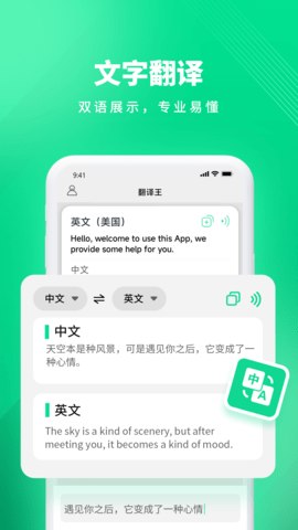 翻译王是一款功能强大的翻译应用,为用户提供全面便捷的翻译服务体验。它拥有简洁易用的界面设计,让用户能够轻松上手,无论是学习、工作还是旅行,翻译王都能成为您的得力助手。除了文字翻译外,翻译王还提供双语展示的文字翻译功能,让用户能够更加清晰地理解翻译结果。不论是专业术语还是常用词汇,都能以专业易懂的方式呈现给用户,帮助他们更加准确地理解翻译内容。