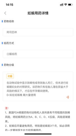 3、 在妊娠用药详情页面,我们将显示复方成分,并且用户可以点击分级查看妊娠用药分级说明。