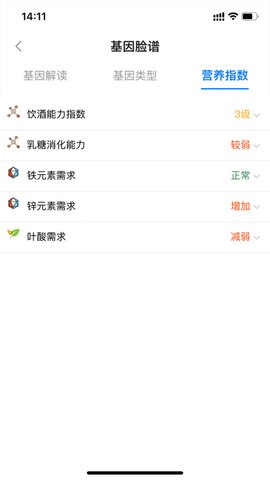 2、此外营养指数功能提供了基于基因检测的个人饮酒能力、乳糖消化能力、叶酸利用能力等指标,为妊娠、儿童发育、疾病预防等提供个体化营养摄入提醒。