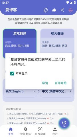 2、 除了以上功能,爱译客翻译器还支持自动翻译、屏幕区域翻译、聊天翻译、照片翻译、翻译历史记录、文字复制、截图等。