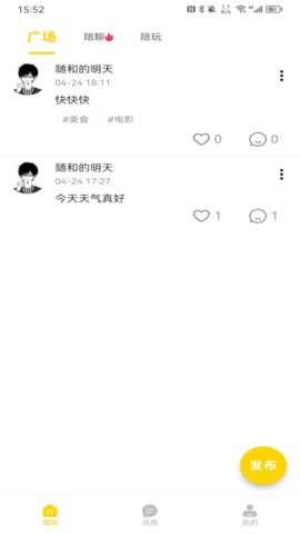1、用户可以在广场圈子里发布最新动态、心事等,与其他用户进行互动。
