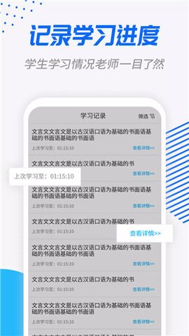 1、教师端可以查看每个学生的学习进度、出勤率等信息,方便管理学生。