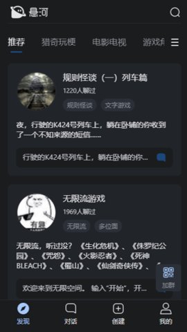 2、 在悬河中,用户不仅可以与虚拟角色聊天,还可以体验互动文字游戏,这是一种全新的大语言模型玩法。