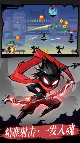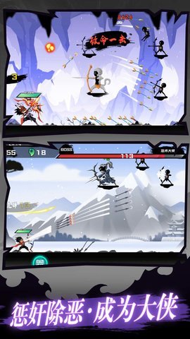 1、游戏采用了剪影画风的水墨江湖,玩家可以召集火柴人大侠,化身神箭手,拿起弓箭武器搭配技能组队挑战BOSS,一起闯荡江湖。