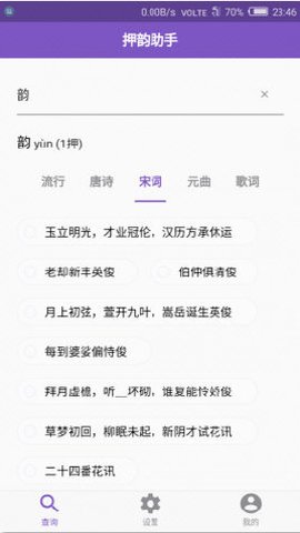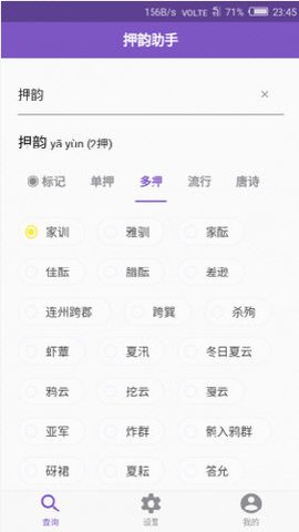押韵机器是一款非常实用的工具应用。它可以帮助用户查找押韵的字、词汇、唐诗、网络热词、Rap多押等内容。只需要输入你想要押韵的字,就可以查询到所有与之押韵的字、词汇、唐诗等信息。