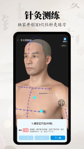 2、 除了以上功能,应用还提供了穴位定位练习功能,帮助用户掌握穴位的定位方法。