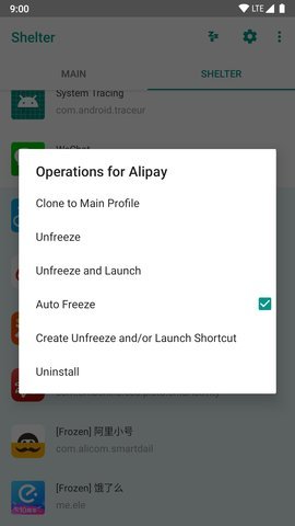 2、当用户不再需要使用微信时,只需在Shelter中点击右上角的Z图标,就能一键冻结微信应用,连图标都会隐藏,数据空间完全隔离。