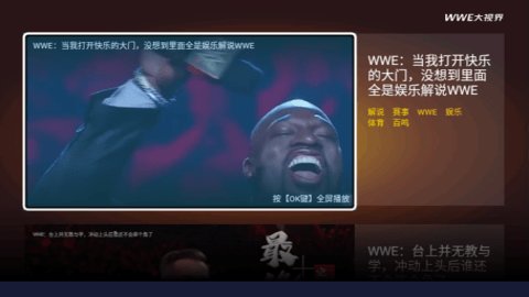 1、虽然wwe大视界主要以英文播放为主,但它不仅仅是一个竞赛和竞技视频的大屏播放软件,它是一款专为电视端设计的、内容均为WWE官方授权的TV应用。