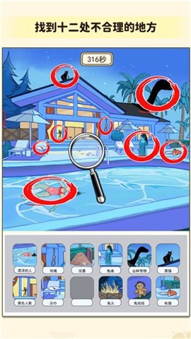 找出不合理是一款充满乐趣和挑战的游戏,玩家可以通过不同的找茬模式和道具来完成任务,体验不同的游戏体验。游戏中提供了多样的找茬道具,玩家可以根据实际情况选择使用,这些道具会给玩家带来更多的帮助。每天都会有全新的找茬任务,让玩家能够不断尝试体验更多新颖的挑战,同时也会让玩家的游戏体验更加丰富多彩。