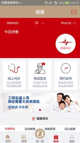 4、 工银安盛还提供了健康管理功能,为用户提供健康资讯、线上问诊、医生、预约挂号和每日步数等服务,让用户时刻关注自身健康。