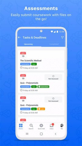 4、在底部菜单栏,学生用户能够点击快速添加递交课程作业、使用移动端扫描仪、添加CAS体验或发布反思,并一键访问消息和通知,同时还可以使用强大的全站搜索功能。