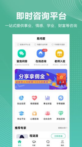 1、 在易问君软件上,用户可以找到超多在线专家,他们可以帮助解答各种疑惑。