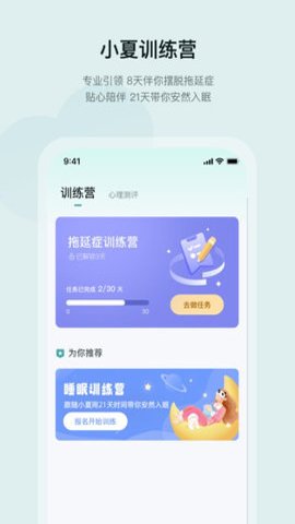 1、 小夏在呢提供了专项解决的训练营,针对情绪、睡眠、拖延等生活难题,帮助用户在定制的8-21天计划中摆脱困扰。