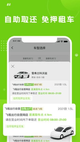 4、飞租出行让用户随时可以打车,提供多种车型选择,用户可以快速选出自己需要的车型,可以在异地还车。