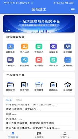 3、 蓝领建工APP是一款主要服务于建筑方面的商务平台,内部汇集了众多的建筑企业、专业班组和技术工人。