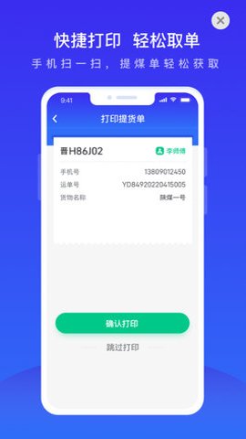 3、只需用手机扫一扫,就可以快捷打印提煤单,轻松取单并实时查看运单的状态。