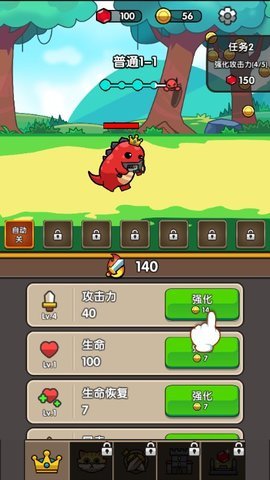 2、游戏的自动战斗系统与放置点击玩法相结合,让玩家需要不断赚取更多金币来提高恐龙的攻击力、血量、恢复力、攻击速度和经验获取效率,从而让你的冒险变得更轻松。